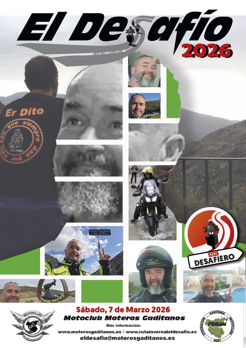 ¡Vete preparao para pasar todo día encima de la moto! Durante la ruta los participantes deberán pasar una prueba de habilidad que no requiere dificultad alguna, ni evidentemente ningún riesgo para los participantes. La ruta transcurrirá por lugares muy bonitos, en su mayor parte por carreteras de montaña, además de carreteras comarcales y nacionales. Al final, aquellos quiénes hayan superado la prueba y completado el recorrido, se les hará entrega de un diploma acreditativo de la realización del Desafío. Aunque no es necesario participar en grupos, si quieres ya puedes ir formando el tuyo. Esperamos y deseamos verte en la ruta.